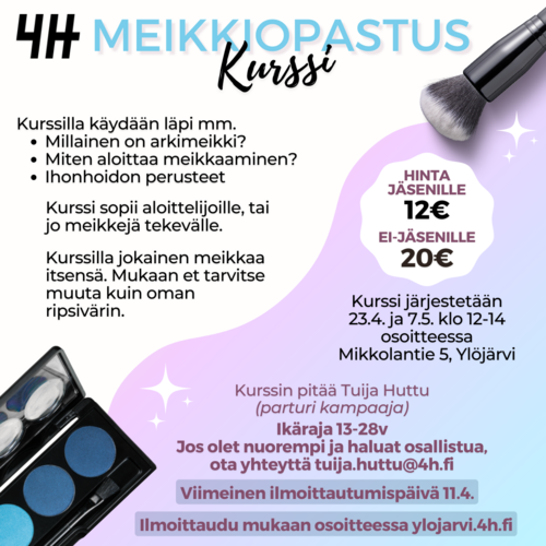 Sitovat ilmoittautumiset alla olevalla lomakkeelle 23.4.2022 alkavalle Meikkiopastus kurssille. Kurssi on kaksi päiväinen. Eka päivä on 23.4. ja toinen 7.5.