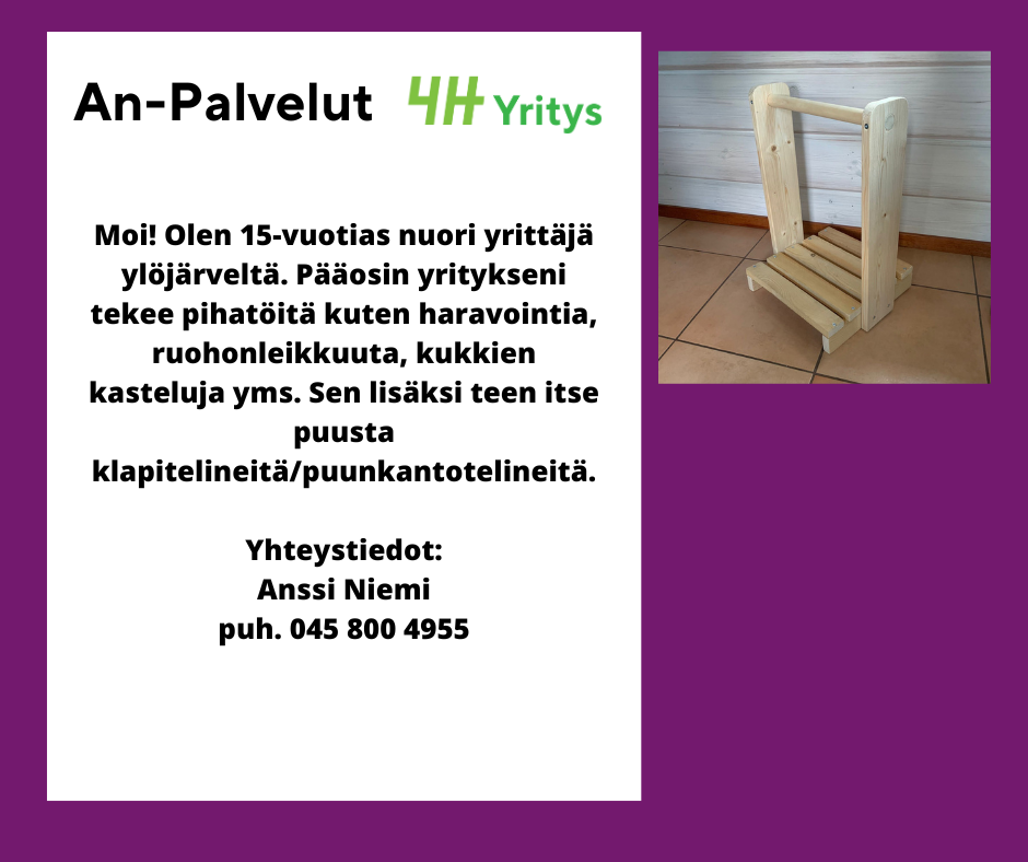 Ylöjärven alueella toimii eri toimialueiden 4H yrittäjiä. Katso löydätkö alta etsimäsi palvelun. Voit ottaa suoraan yhteyttä 4H yrittäjään. 4H yrittäjän nettisivuille pääset klikkaamalla nimestä.